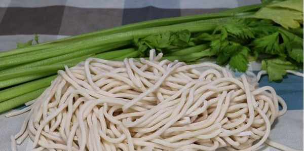 2、先把准备好的面条取出来,将它放到一个盘中,然后再放到一边备用,接下来再把咱们准备好的芹菜取出来,先将芹菜的根部和黄叶子全部摘掉,其他比较好的叶子就不需要去掉了,可以直接食用。芹菜去掉根部和黄色的叶子之后,咱们先将芹菜切成小段,把切好的小段放到一个大碗中,然后加入适量的清水,将其清洗干净。
