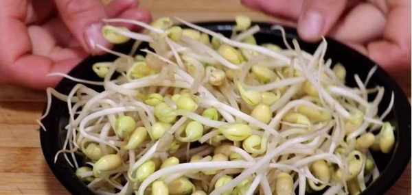 3、清洗干净之后,咱们将其捞出来控干水分,然后再把黄豆芽取出来,将它放到一个大碗中加入适量的清水清洗干净,清洗完了之后同样的放到一旁备用,然后再将准备好的大蒜取出来,将大蒜切成片,小葱切成葱花。