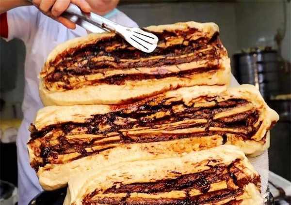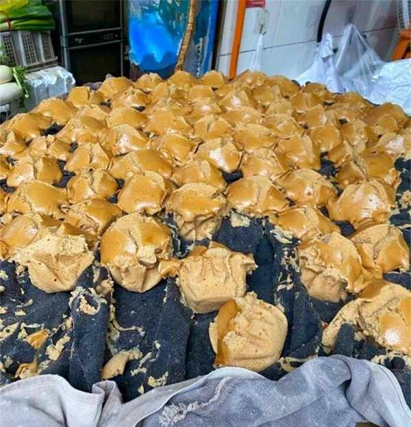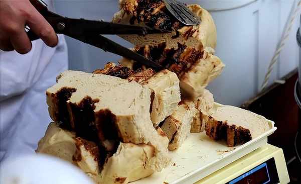 一锅杂粮发糕售价50元左右,按斤售卖,蒸熟后售卖10元一斤,个头很大,正常3个大小不一的就装满整个蒸盘,会按照顾客购买的量切断称重。这样蒸出来的发糕吃起来有枣泥的那种口感,上层涂满了本地的土红糖,糖香味十足,嚼起来会有回弹且劲道的口感,整个口味是杂粮自带的微甜加上红糖渗入的甜,完全不用担心太甜。