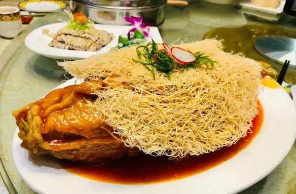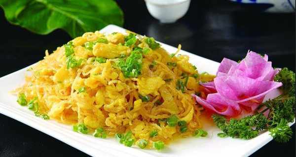 猪皮丝细如粉条,被蛋黄包裹着,仿佛身披黄金衣,油炸后颜色更明艳,口感弹韧,富含丰富的蛋白质,女性越吃越美丽动人。