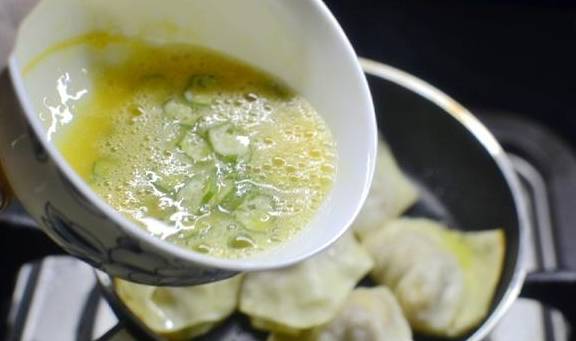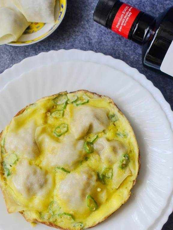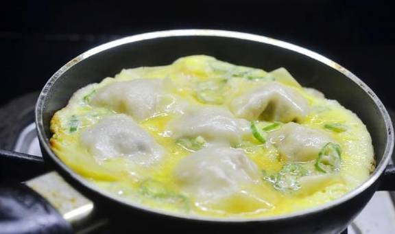 首先少许油放入馄饨小火煎定型,然后倒入打好的蛋液(蛋液可以放点盐和葱什么的)