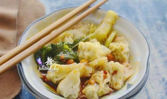 看图就知道,用了花生酱,芝麻油拌的,然后生抽香醋糖鸡精做调味,馄饨煮好捞起就可以拌