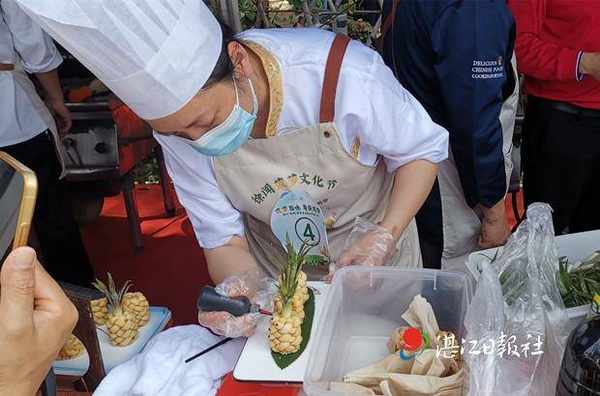 活动现场,一块块香嫩可口的菠萝,被烹饪出一道道色香味俱全的“菠萝菜”,让人垂涎三尺,引来广大村民和旅客竞相品尝。在寻找民间削菠萝“神刀手”比赛,选手们眼疾手快,手起刀落,一个“满身盔甲”的菠萝很快被削出金黄的果肉,香气四溢。