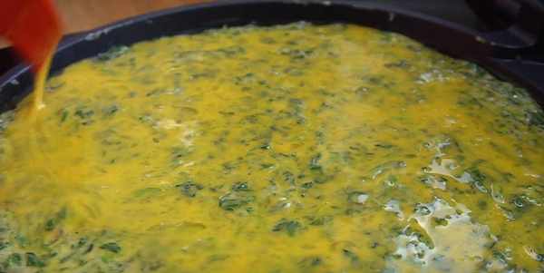 7.起锅刷油,油热下入面糊,把它平铺开来,在表面打入一个鸡蛋。盖上盖子,开最小火烙。