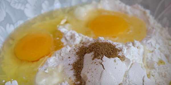4.300克,面粉放入盆中,加入3个鸡蛋,调入适量的盐跟五香粉,搅拌均匀。