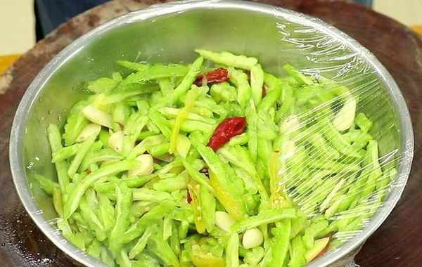 4.苦瓜腌好以后倒出来,再用清水冲洗一遍,捞出来挤干水分,这样才好入味,把调好的腌料给苦瓜倒一块,抓拌均匀,封上保鲜膜放冰箱里冷藏腌制三个小时以上。