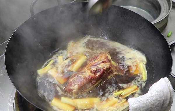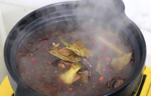 4.牛肉腌好以后和腌料一起倒入锅中,加入适量的清水没过牛肉,开小火慢慢煮出牛肉的血水和杂质,水开以后撇去上面的浮沫,煮2分钟左右,牛肉煮变色以后,把牛肉和汤汁一起倒入砂锅中,小火慢炖2个小时。