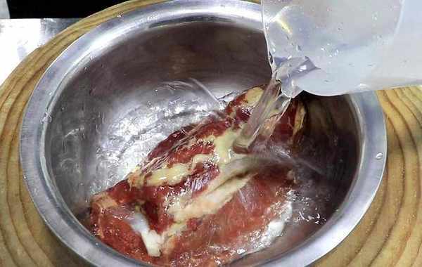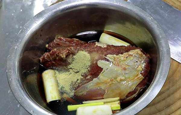 1.准备牛肉500克放入盆中,倒入清水没过牛肉,浸泡2个小时,中间每半小时更换一次清水。2个小时后挤压出牛肉的血水,清洗干净后捞出备用,浸泡的目的是充分去除牛肉中的血水。