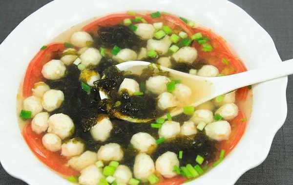 5.丸子全部下锅以后再开火,水开以后大概煮2分钟丸子就煮熟了,捞出丸子倒入刚才准备好的盆里,把西红柿放在盘边就可以了,美味即成。