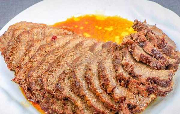 6.2个小时以后把火关掉再焖20分钟,焖制能使牛肉更加香醇入味。20分钟以后打开锅盖,捞出炖好的牛肉,顶着牛肉纹理切成均匀厚片,再把酱汁均匀淋在切好的牛肉上,美味即成。