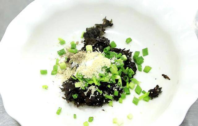 3.切点葱花、姜末放入盆中,用清水泡上。再切点葱花、西红柿片备用。准备一个小盆,放入小葱花和紫菜,加入适量的食盐、鸡粉、胡椒粉。