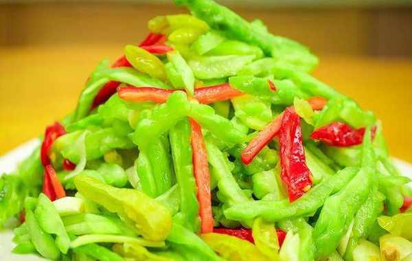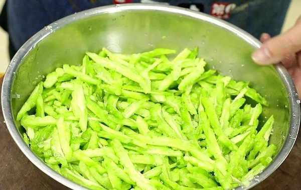 1.准备几根苦瓜,切去两头破开,去除里面的白瓤,苦瓜的苦味基本上都源于瓤,去得越干净苦味就越低,处理好以后斜刀切成片用清水泡上,多淘洗几遍,尽可能地减少苦味,把水分控干净,加几勺糖拌匀,腌上20分钟。