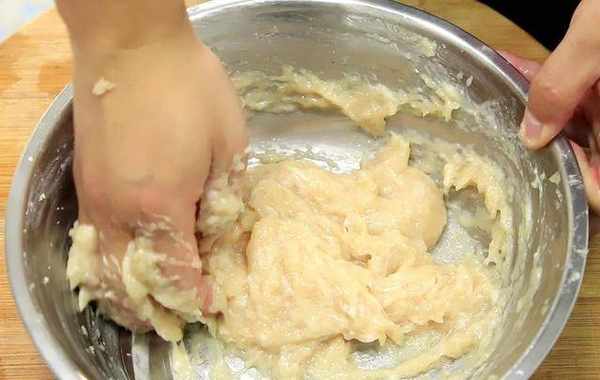 1.准备适量的炖鸡胸肉,剁成肉末放在盆中,放入适量的食盐、鸡粉、胡椒粉、料酒,搅拌摔打给肉馅上劲,倒入葱姜水继续搅拌,这个搅拌过程要5分钟,利用摩擦拉扯让肉馅充分吸收水分,吸足水分的肉泥口感才会更加滑嫩。