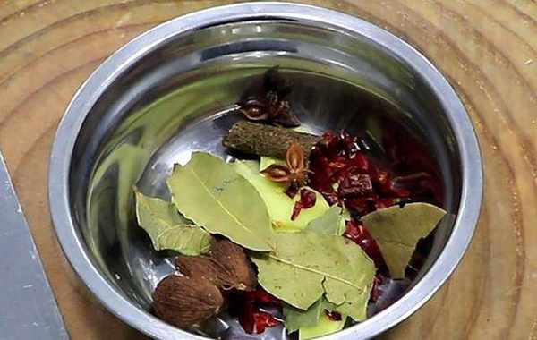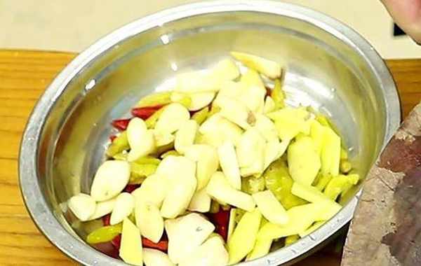 2.切点姜片放入盆中,加入一把干辣椒,草果一个,拍散去籽,几片香叶,一片桂皮,2粒八角,一小撮花椒放在一起备用。