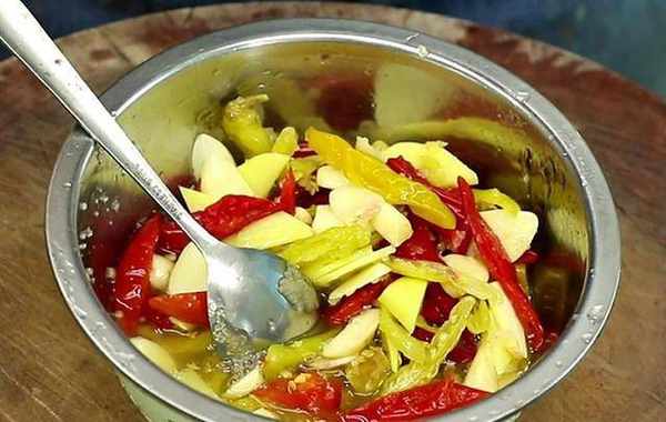 5.三个小时以后汁已经差不多全部吸收了,再倒入一点红椒丝,抓拌均匀即可装盘,美味即成。