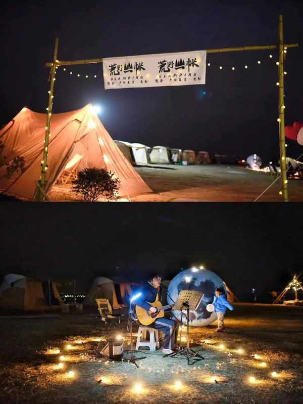 岛上一侧“漫山·遍野UTOPIA露营地”,超大片草坪,一顶顶纯白色帐篷支在其中,清新文艺。夜晚灯光点亮,再配上音乐,氛围感满满。