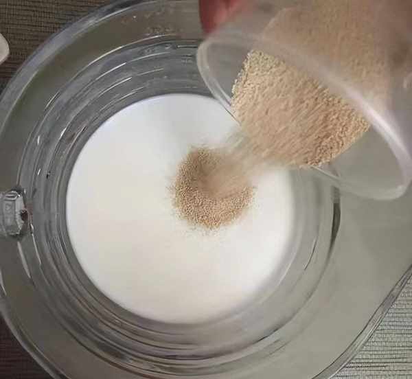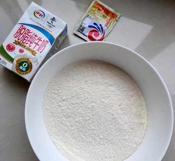 首先,取干净的面盆将400g面粉倒入盆中,取小碗用温牛奶将酵母化开。注意牛奶不能太热,太热会将酵母菌杀死,温度过低酵母也会休眠,一般37度左右的温水就可以,这个温度刚好使使酵母菌重新开始活动。