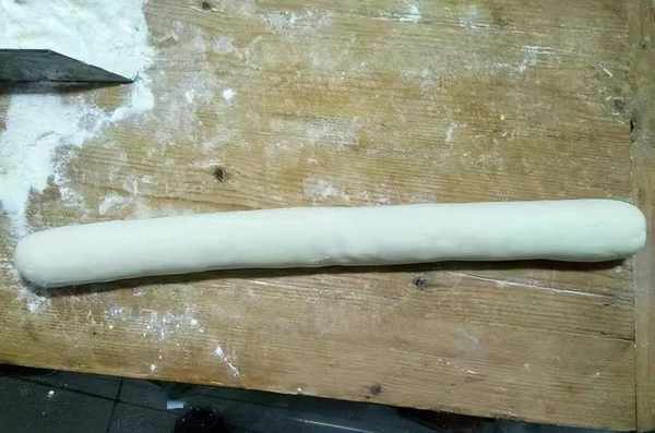 将面团搓成长条,在面板上撒上干面粉防粘,用刀切成6等份。