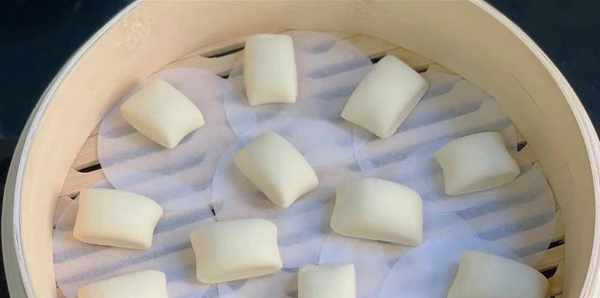 蒸锅上放水,烧至温热关火,上笼屉,放入切好的馒头。馒头之间要保持一定的距离,防止因发酵粘连到一起。盖上锅盖利用水的余温发酵30-40分钟,直到体积变成原来的1.5倍左右,整体看上去均匀松弛轻盈饱满就发酵好了。