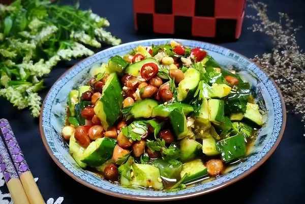 4.热锅烧油,油五六成热时,开始放入花生米,炸至微微变色,放进黄瓜盆中,倒入刚刚填好的调味料,搅拌均匀,一道清脆爽口又开胃的凉拌菜就做好了。