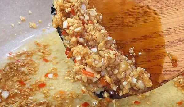 4、 热锅倒入花生油,放入大蒜、小米辣末,炒至金黄色,放入适量的酱油、蚝油、盐、清水,煮开后倒入碗中备用。