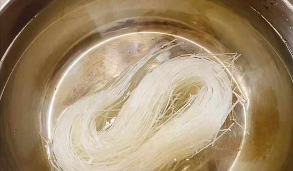 2、 绿豆粉丝放冷水里浸泡10分钟,变软后剪成小段。