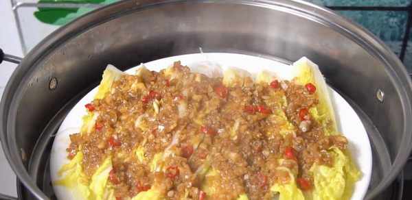 6、 将摆好的娃娃菜放入锅中,隔水蒸15分钟,就可以开吃了。
