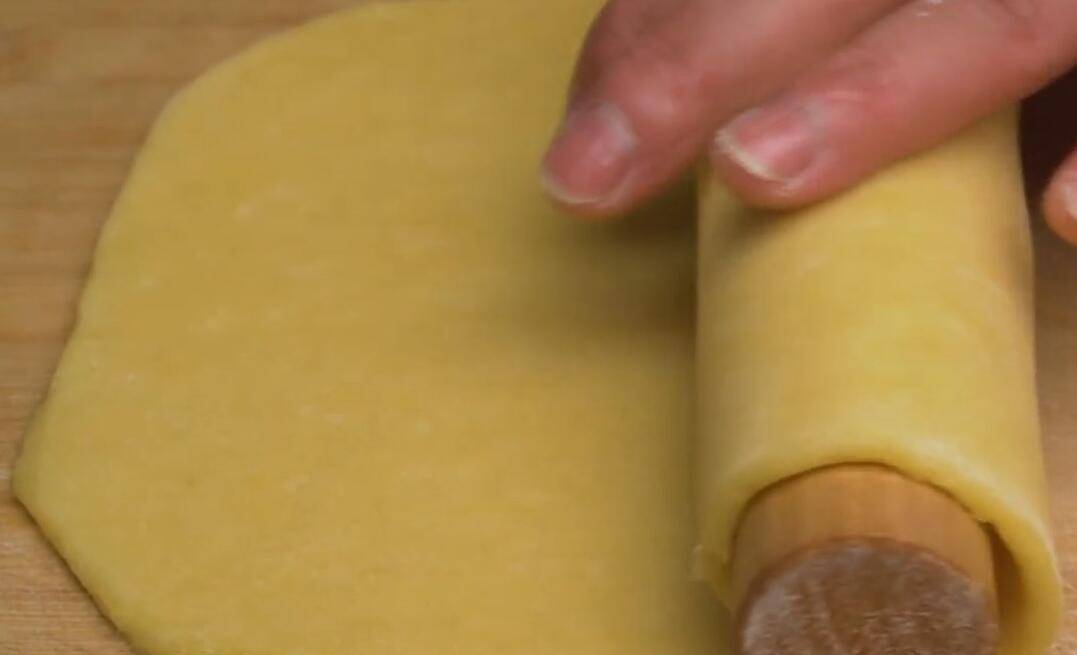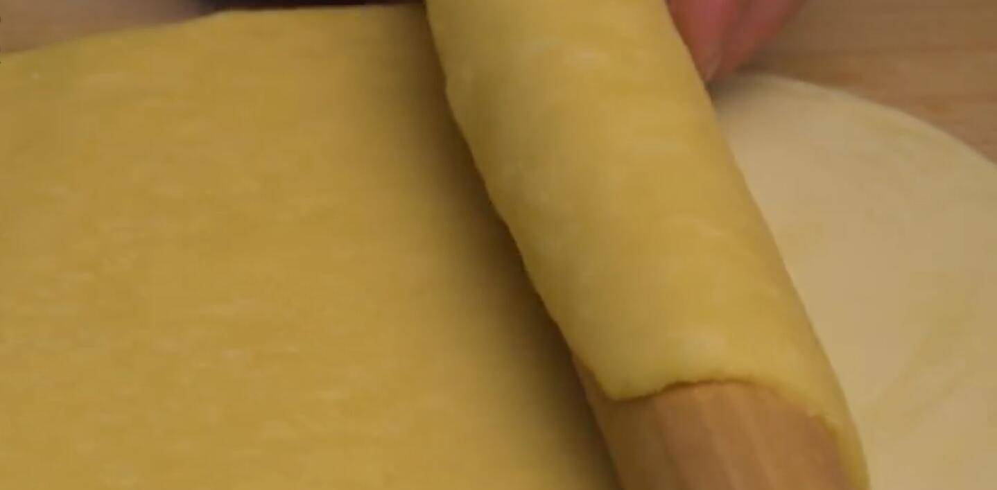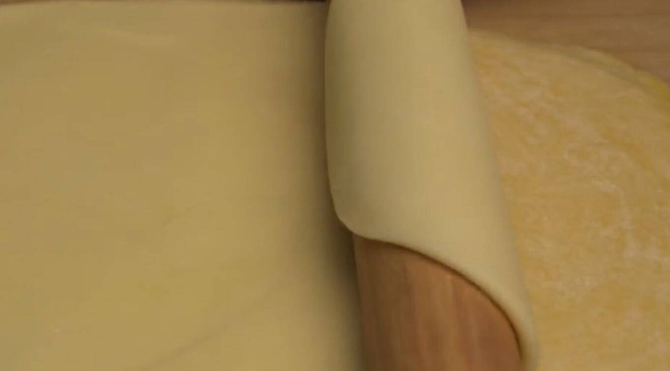第四步:接下来再擀油酥面团:整个醒好面的面团 同样擀成长方形的面片,跟水,面团的面片一致,再用擀面杖卷起来。