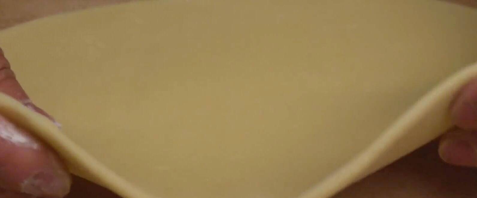 第六步:另外一块水面团同样的操作擀成长方形面片,又在面片的表面刷上一层水之后,再将水面片叠加在上面。