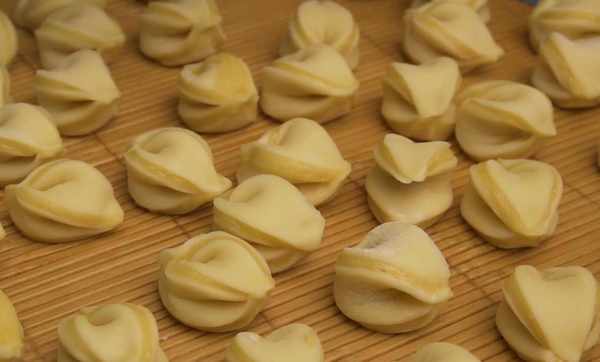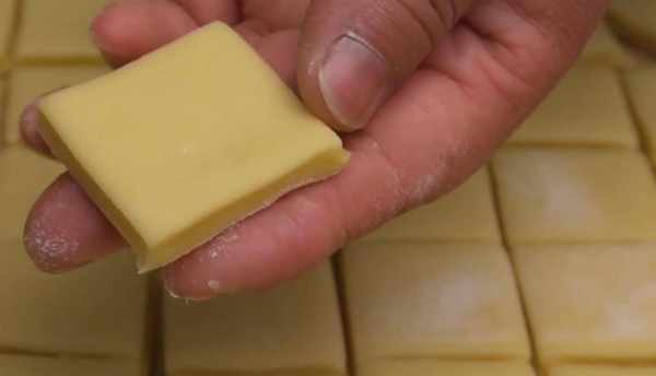第八步:切好的方块对角处沾上一些水之后对折粘合在一起,背面的两个对角同样沾水对折,一个花型核桃酥胚就做好了,同样的操作,把所有的方块都做成核桃酥胚。
