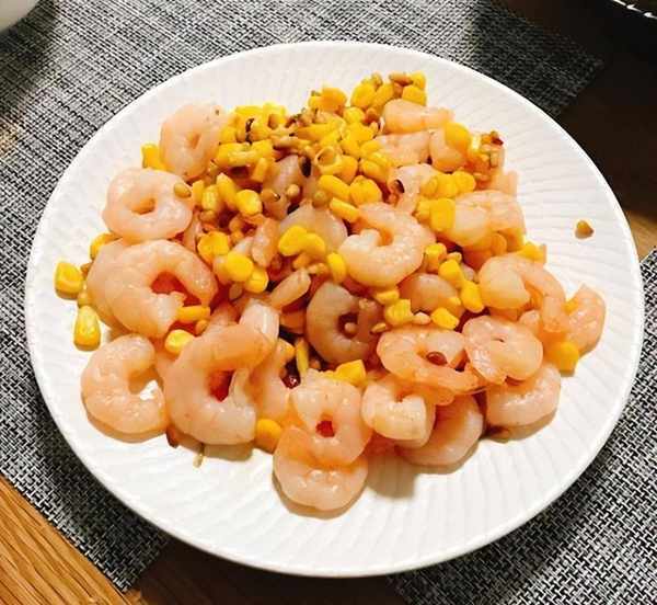 锅内倒油下入虾仁翻炒至变色下入玉米翻炒