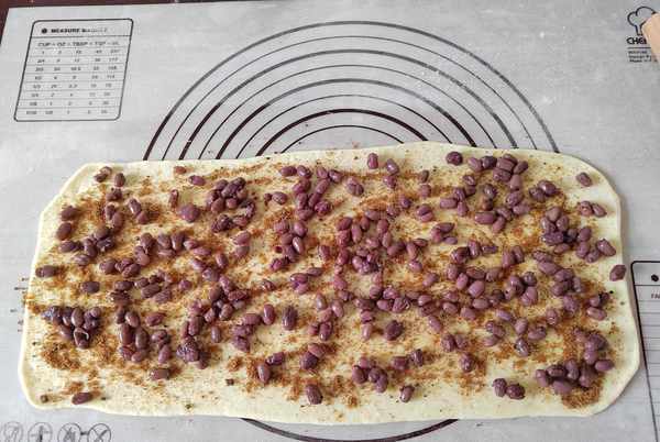 第三步:撒一些干面粉在揉面垫上防粘,把面团擀成长方形的厚面片,撒上红糖和蜜红豆。