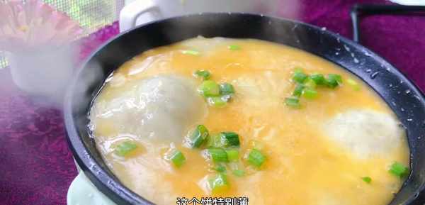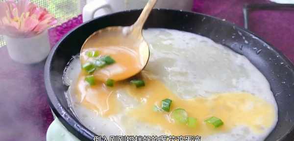 待到面糊稍微定型之后,加入前面调制好的葱花鸡蛋液