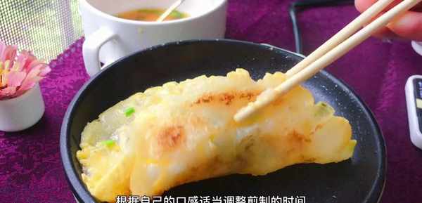 待到上面鸡蛋液定型之后,就可以出锅了,喜欢吃焦一点的可以再多煎一点时间,根据自己的口感适当调制煎制的时间