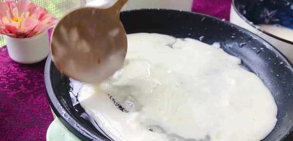 锅预热,加入多一点的油,这样面糊才不会糊锅,倒入面糊之后,小火慢煎