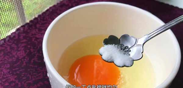 首先拿出一颗鸡蛋,敲碎,加入一丁点盐,搅拌均匀