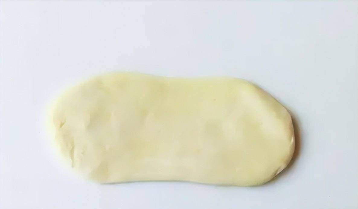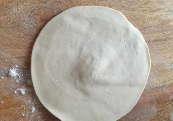 5、接下来我们将调好的油酥放在面片中间,然后像包包子一样将油酥包在里面,再用擀面杖擀成长条形状,或者说是牛舌的形状,然后就可以上锅烙饼了。其余的剂子重复上述的步骤。