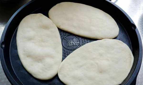 6、将我们的平底锅中刷上一层油,在油四五成热的时候,将我们擀好的牛舌形状的面坯放入锅中,保持中火的状态,慢慢烙饼。烙至一面金黄以后翻面,烙另一面。在我们发现口袋饼慢慢鼓起来的时候,就可以出锅了。