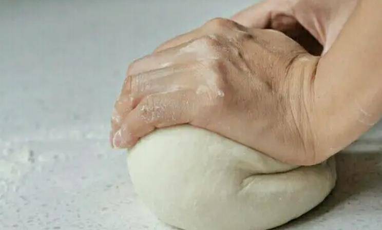3、面团醒发好了以后(大学十多分钟,半个小时左右即可),我们将面团拿出来,放到案板上,案板上提前撒上一层干面粉,用手揉几下醒发好的面团。