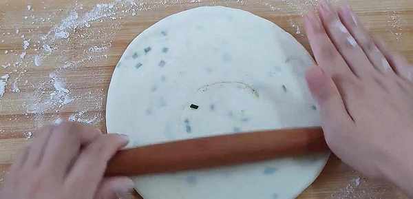 13.松弛好之后就容易擀开。把它擀成0.3厘米左右的薄片。