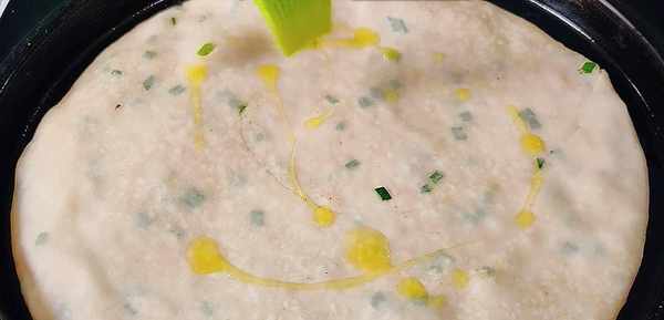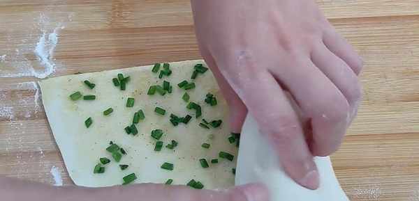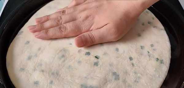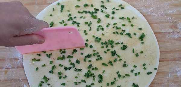 9.接着在表面涂上一层油酥,再撒点葱花,然后在半径处划上一刀。