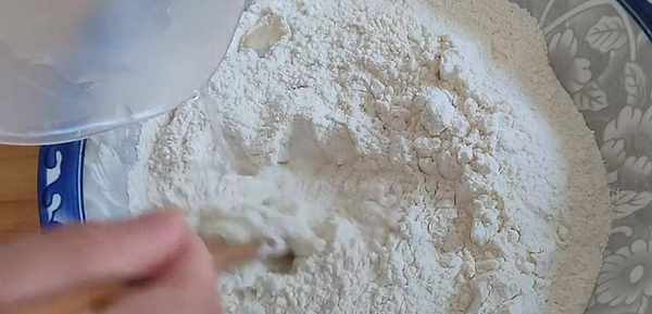 1.400克面粉放入盆中,加入适量盐增加面粉筋性,搅拌均匀。一半用130毫升开水烫面,一边倒一边搅拌。搅拌成面絮。