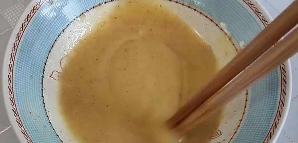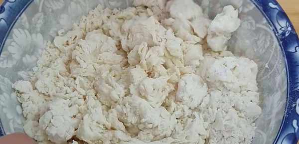 2.另一半用冷水和面,同样搅拌成面絮。接着混合均匀。水量不会很大,开水烫面会很吸水。