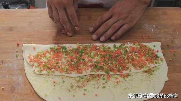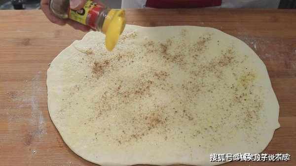 擀薄以后,抹上一层植物油,抹均匀以后再撒上薄薄的一层椒盐。