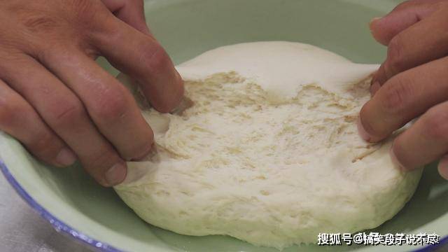 2个小时以后,面团膨胀到原来的两倍大,用手扒开面团看一下,里面呈蜂窝状,这个时候面团已经发酵好了。