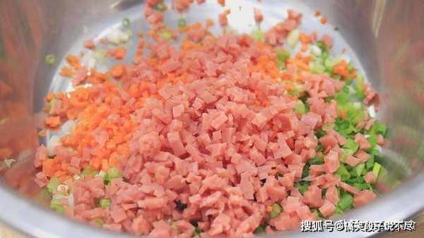 这个时间我们来切一点小葱花和胡萝卜粒,再切一点火腿肠粒,放在一起。