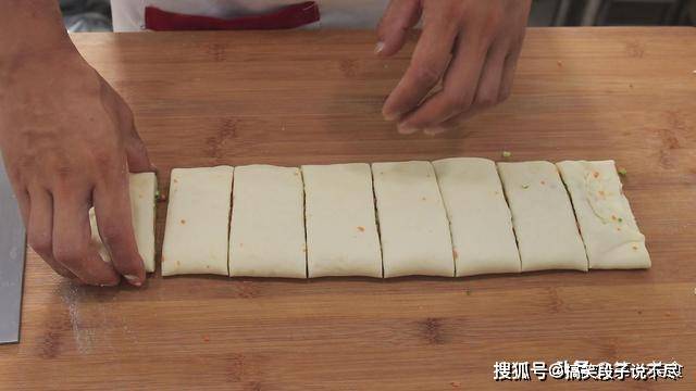 再把另一侧也折起来,卷实一点,用手按压一下,压实一点,用刀切成4厘米宽的小段。