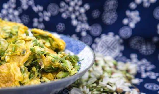 锅中油烧热,油烧开后,倒入玉千蛋的汁液,用小火加热至熟形焦黄,即可切碎上桌。