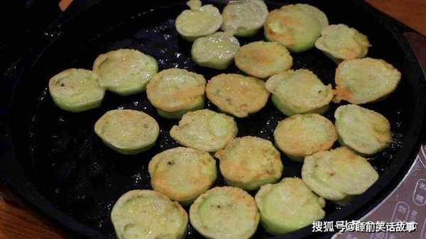 3.食材全部准备好以后,我们开始烙制,电饼铛预热3分钟,均匀淋上植物油,把裹好面糊的茄子逐个放入锅中,盖上锅盖烙2分钟,面糊全部定型以后,我们把茄子翻一下面。