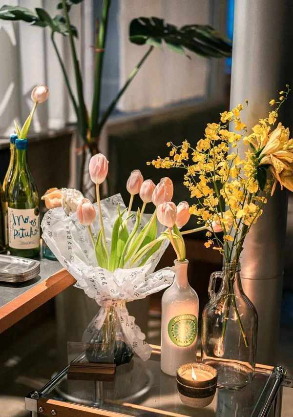 暖黄的灯光搭配灰色墙体木色桌椅,柔和没有攻击性,桌间距比较近,但不影响大家喝点小酒,拍点照片。起码在环境营造上,越来越多年轻人愿意选择这类新晋社交场所。